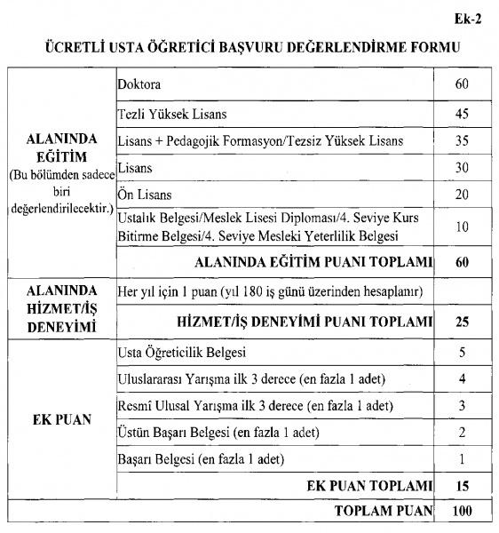 “a) Görev verilecek ücretli usta öğreticiler, Ek-2’deki Ücretli Usta Öğretici Başvuru Değerlendirme Formuna göre belirlenir. Başvuru sonuçları eylül ayının 15’ine kadar ilan edilir. Bu sıralama bir yıl süreyle geçerlidir.”